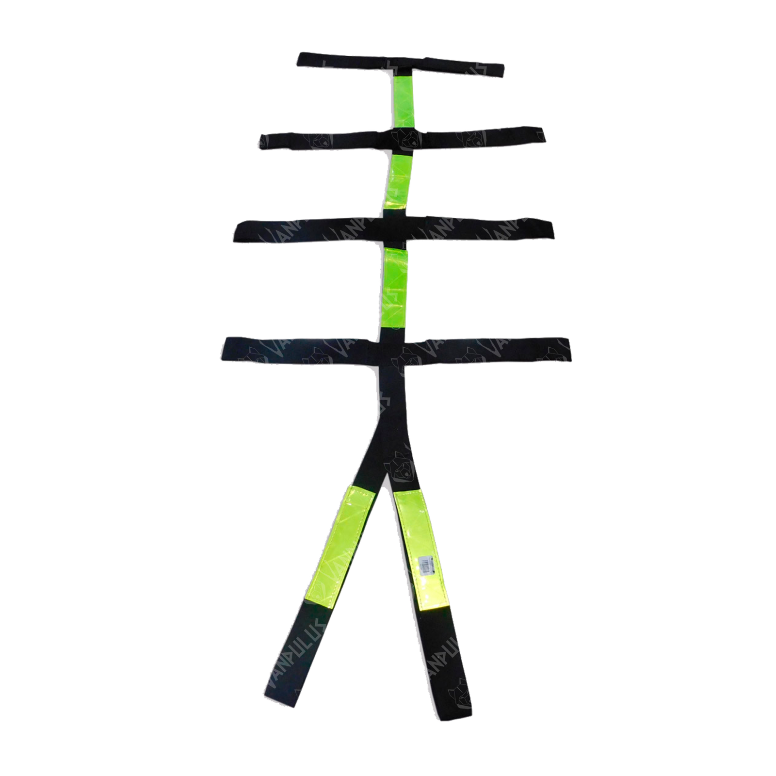 Arnés de seguridad tipo araña diseñado para inmovilización rápida y segura de pacientes en camillas de emergencia. Fabricado con correas de poliéster de alta resistencia, incluye sistema de ajuste con velcro para adaptabilidad inmediata y cintas reflectivas integradas para visibilidad en condiciones de poca luz. Ideal para uso en ambulancias, rescates y entornos hospitalarios