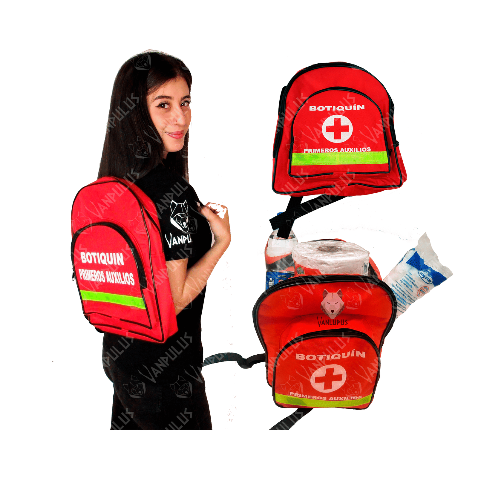 Agua 600ml • Alcohol 120ml • Algodón 20gr • Analgésico (4 unid) • Aplicadores (paq x 20) • Bajalenguas • Curas • Gasa (5 unid) • Guantes • Jeringa • Pañitos húmedos (paq x 10) • Pito • Rollo de papel • Tapabocas • Tijeras • Toalla higiénica • Torniquete • Vaselina 5gr • Venda elástica (2″ x 5 yardas)