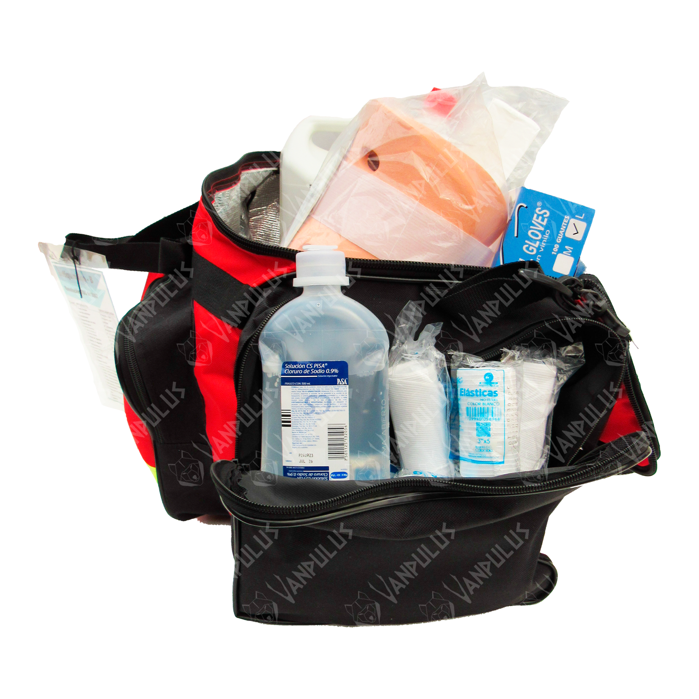🩹 Contenido normativo: Acetaminofén x20, alcohol 345ml, ASA x10, bajalenguas x40, collares cervical (adulto/niño x2), compresas x4, esparadrapo 4″ x2, fonendoscopio, gasas (estéril x20/paq x100), guantes (caja), hidróxido aluminio x10, inmovilizadores extremidades (adulto/niño), linterna dinamo, máscaras RCP x2, solución salina x5, termómetro, tensiómetro, tijeras, vendas (algodón 3×5″/5×5″ x2, elásticas 2×5″/3×5″/5×5″ x2), vasos x25,